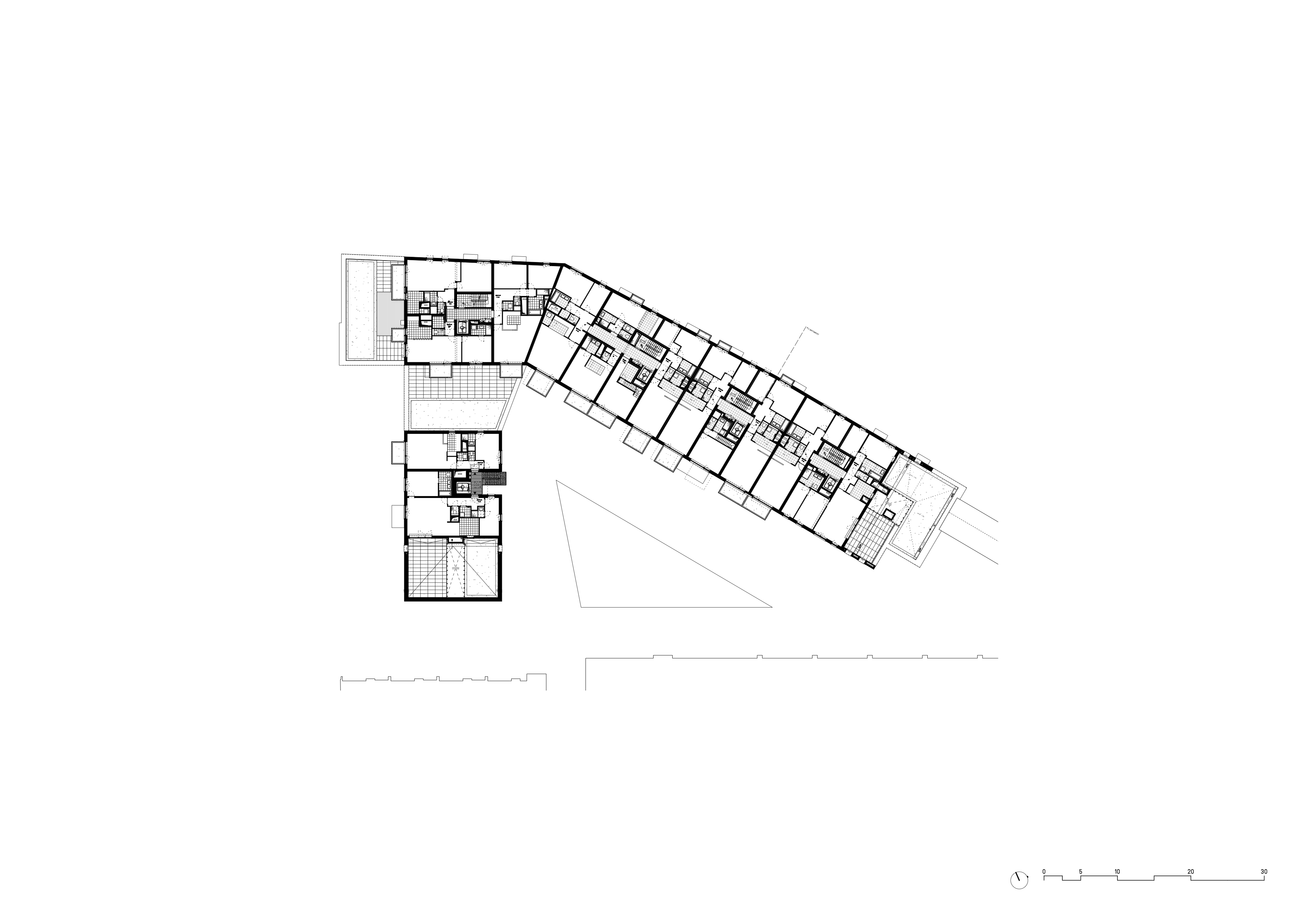 A bird’s eye view of the block offers insight into the great variety of existing built forms present: imposing industrial roofs of all shapes and sizes, small sloped roofs of working class housing, high ‘hollow-toothed ’chimneys … The project slips into this aerial kaleidoscope through its own hop-scotch of roofs: flat or sloped, with or without terraces carved in, covered in natural zinc or green and planted, … each particular geometry contributing to the bigger recognizable picture.
