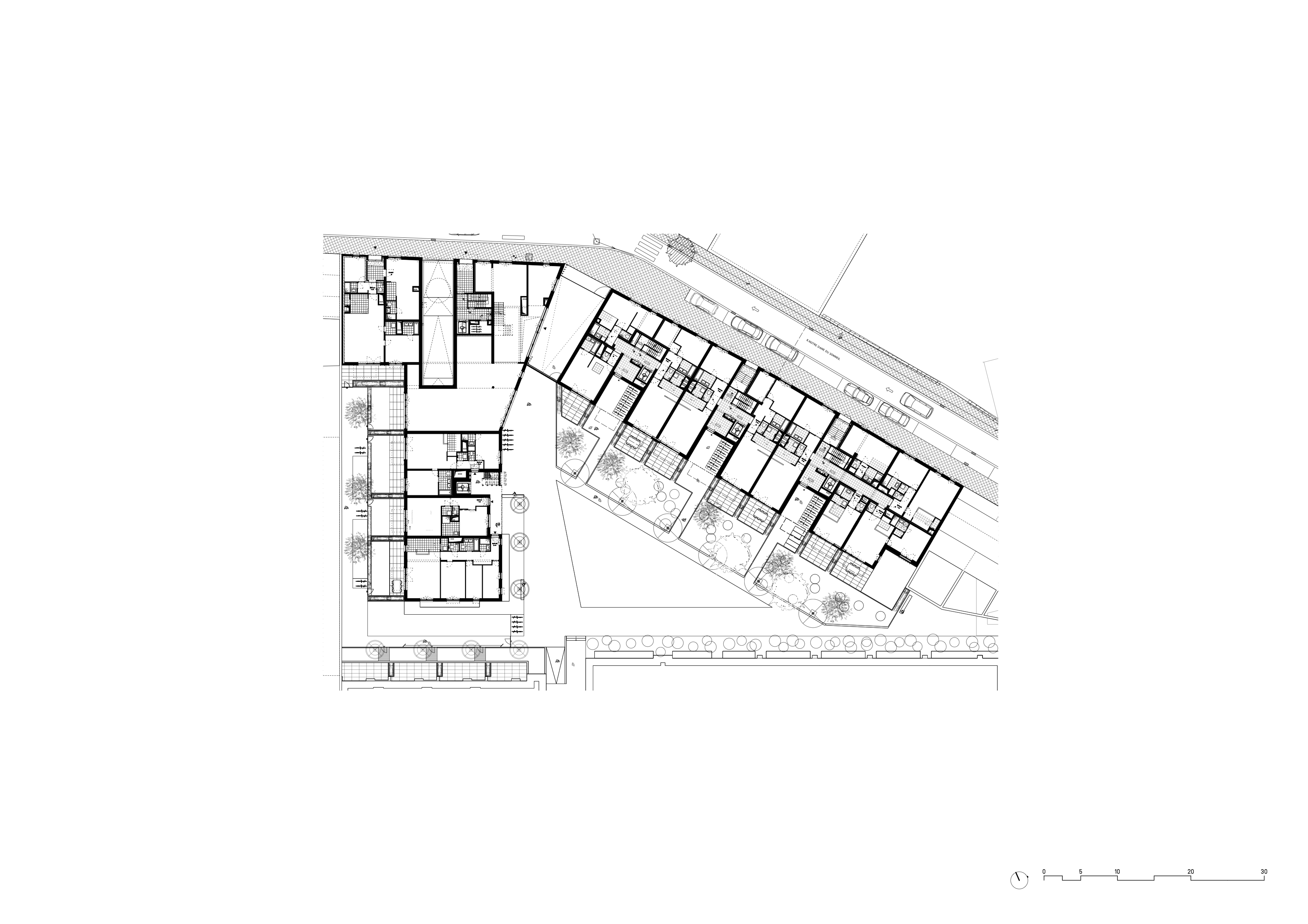 So street views show that surprisingly, this little winding street nestled between the two is able to rely on its own intimate scale to create quiet pockets of breathing space, as the numerous semi-open street intersections bear witness. The Clos du Marais easily fits into this urban fabric, offering yet another breather in the form of a semi-public garden (a “clos”) accessible through a double-height porch. Once you walk in leaving the street-scape behind, you are in a different world. Wide terraces are organized around the generously planted haven, but also communal spaces, a day-care center, open-air stairwells and the bicycle locale.