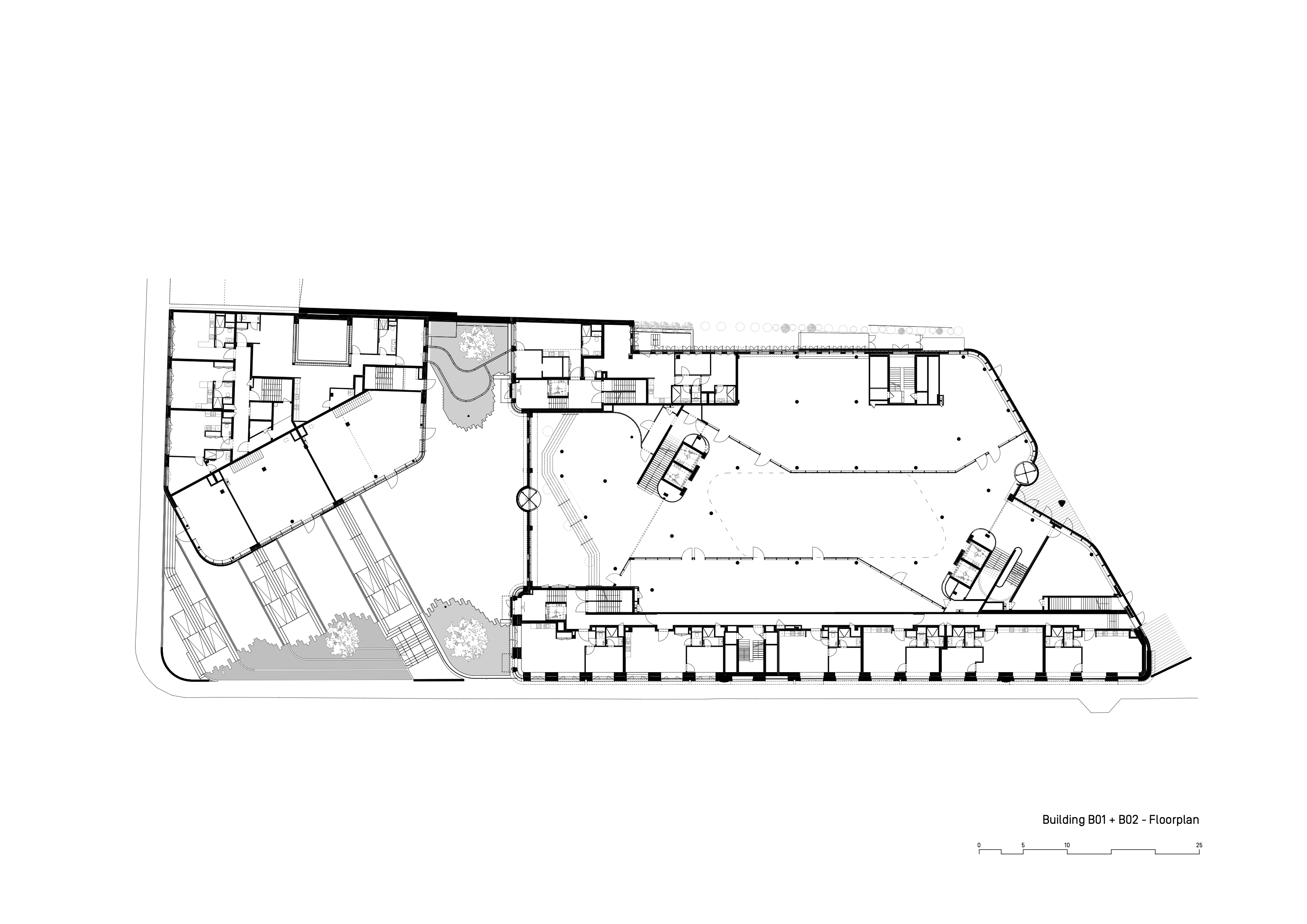 B01’s volume initially aligns with neighbouring buildings before curving and lowering toward the central forecourt, opening perspectives and guiding pedestrian flows. This volumetric adjustment softens the transition between public space and buildings while asserting a strong urban presence.