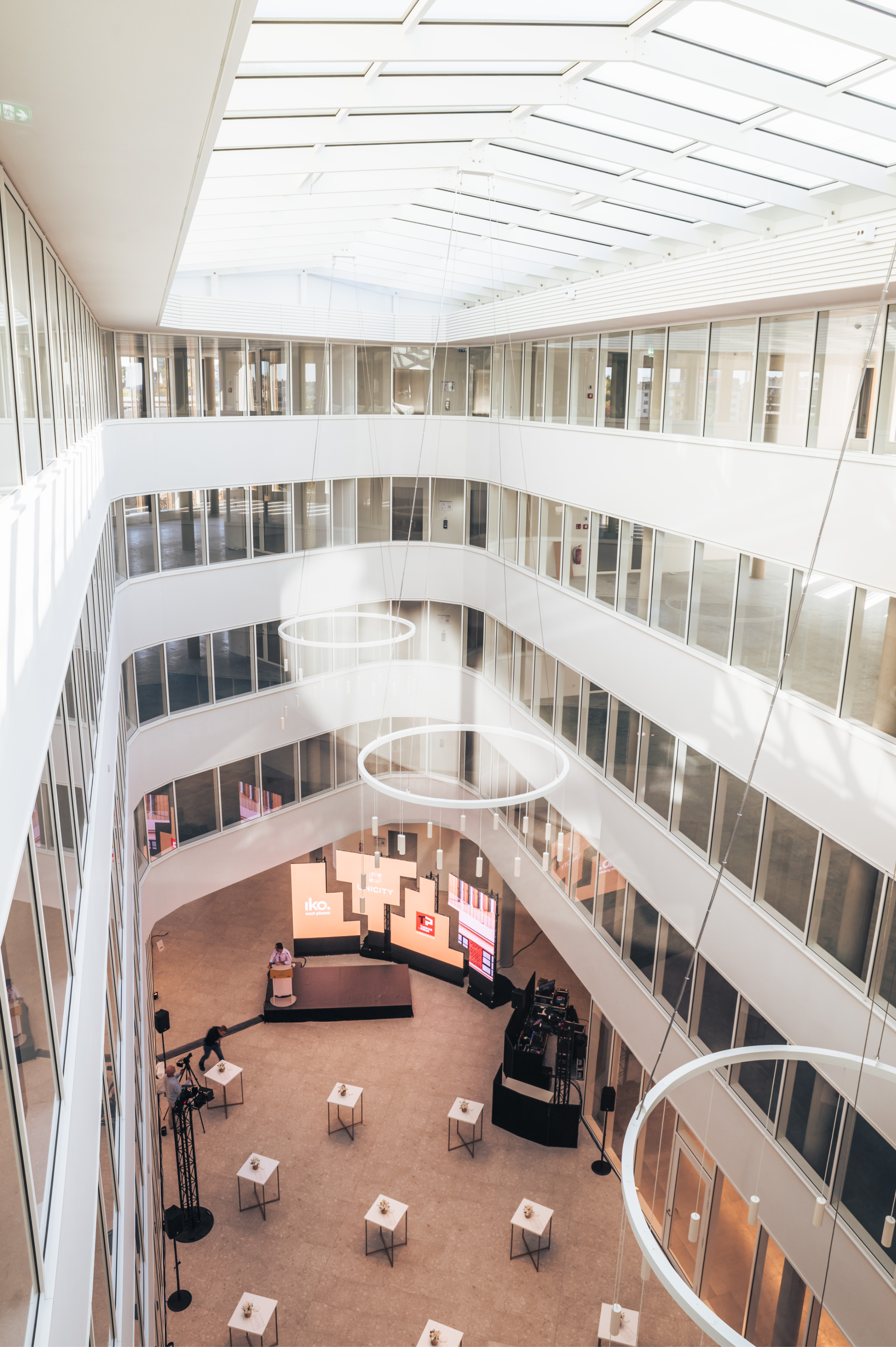 Two circulation cores consist of large staircases wrapping around curved elevator cores opening onto the sunlit atrium.