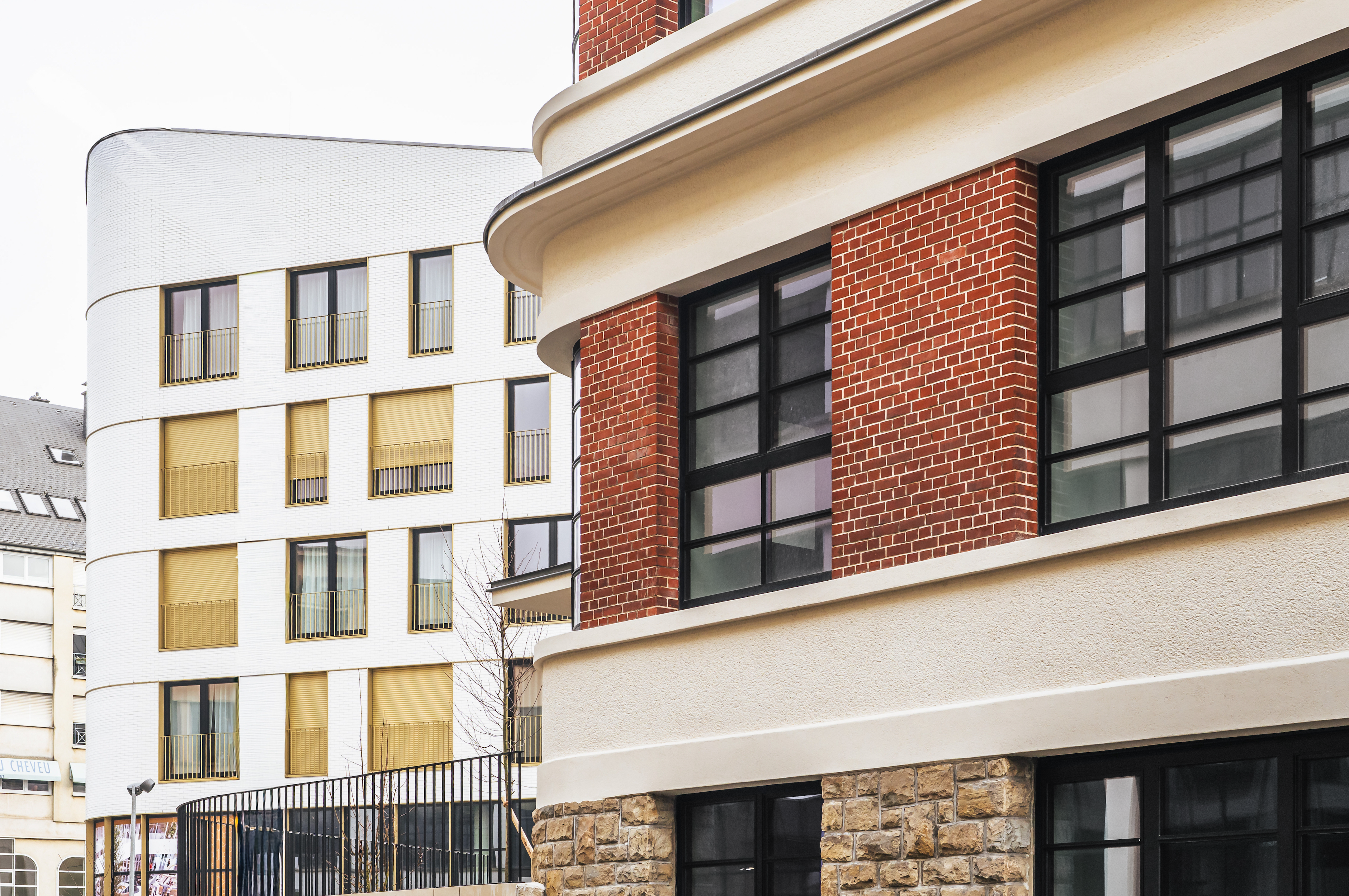 From this historic base, the project deploys a contemporary extension adopting curved, fluid lines, almost soft, inspired by the Art Deco language of the preserved façades.